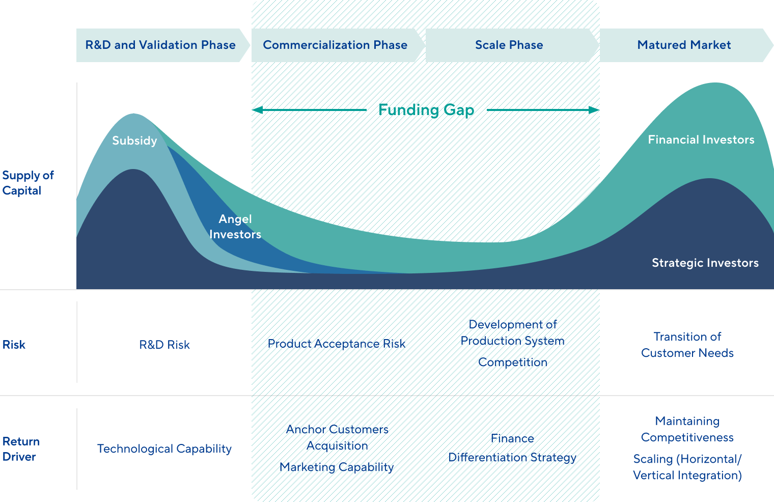 Even though the companies in commercializaiton/scaling phase require significant capital to scale, the available pool for funding is limited due to the higher inherent risks (e.g. composed of commercial risks, technological risks etc.).